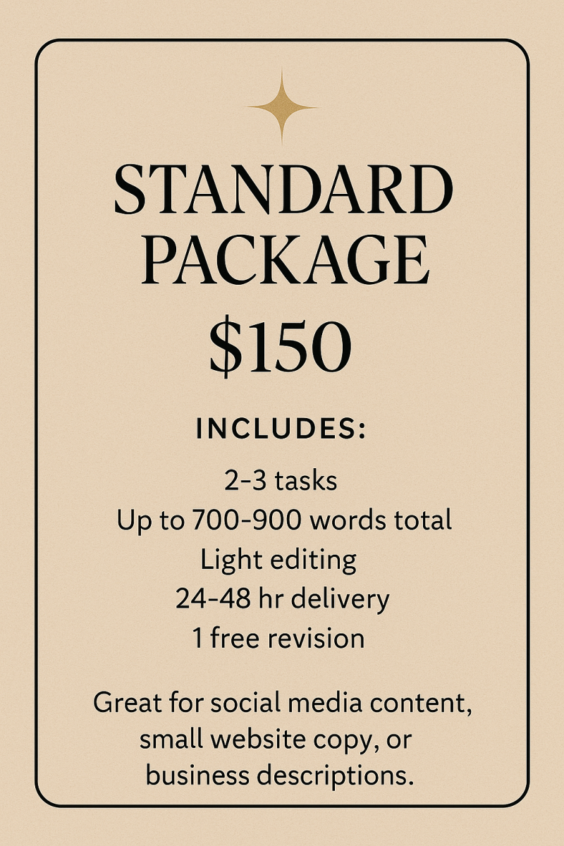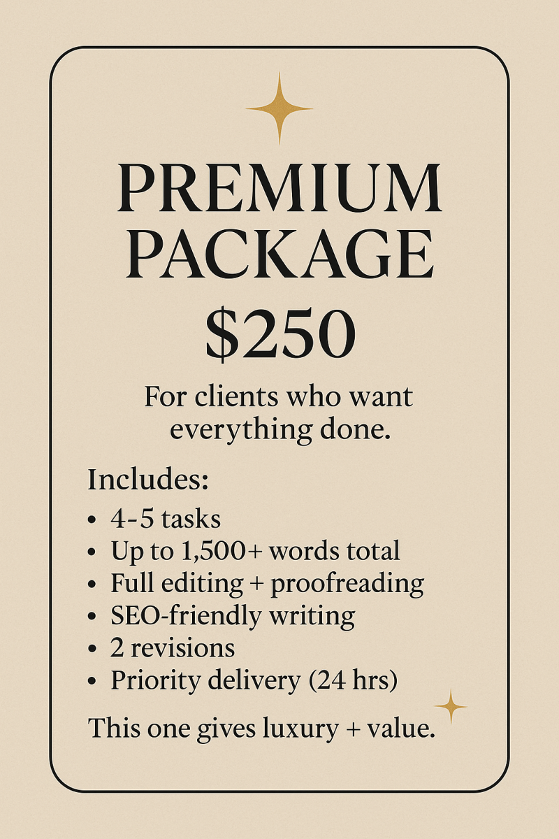 A full-service option for clients who want everything handled. Includes 4–5 tasks, up to 1,500+ words, full editing, SEO-friendly writing, 2 revisions, and 24-hr priority delivery. Premium results, done fast.